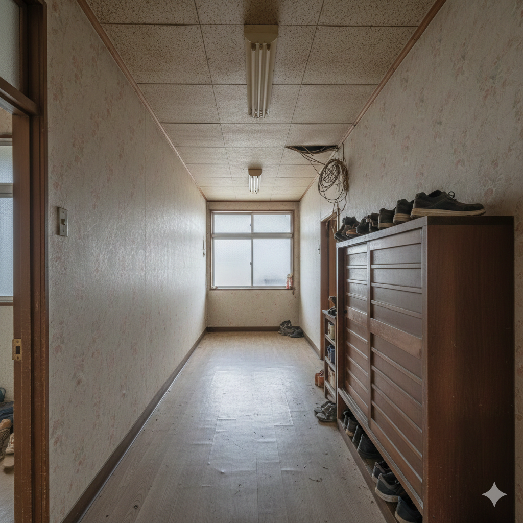 老朽化した木造住宅のフルリノベーション事例です。玄関を入ってすぐの場所に、趣味のロードバイクをそのまま持ち込める広い土間スペース(モルタル仕上げ)を新設。リビングの天井は既存の梁をあえて見せることで天井高を確保し、開放感を出しました。キッチンはモルタルとアイアンを組み合わせ、カフェのようなブルックリンスタイルに仕上げています。